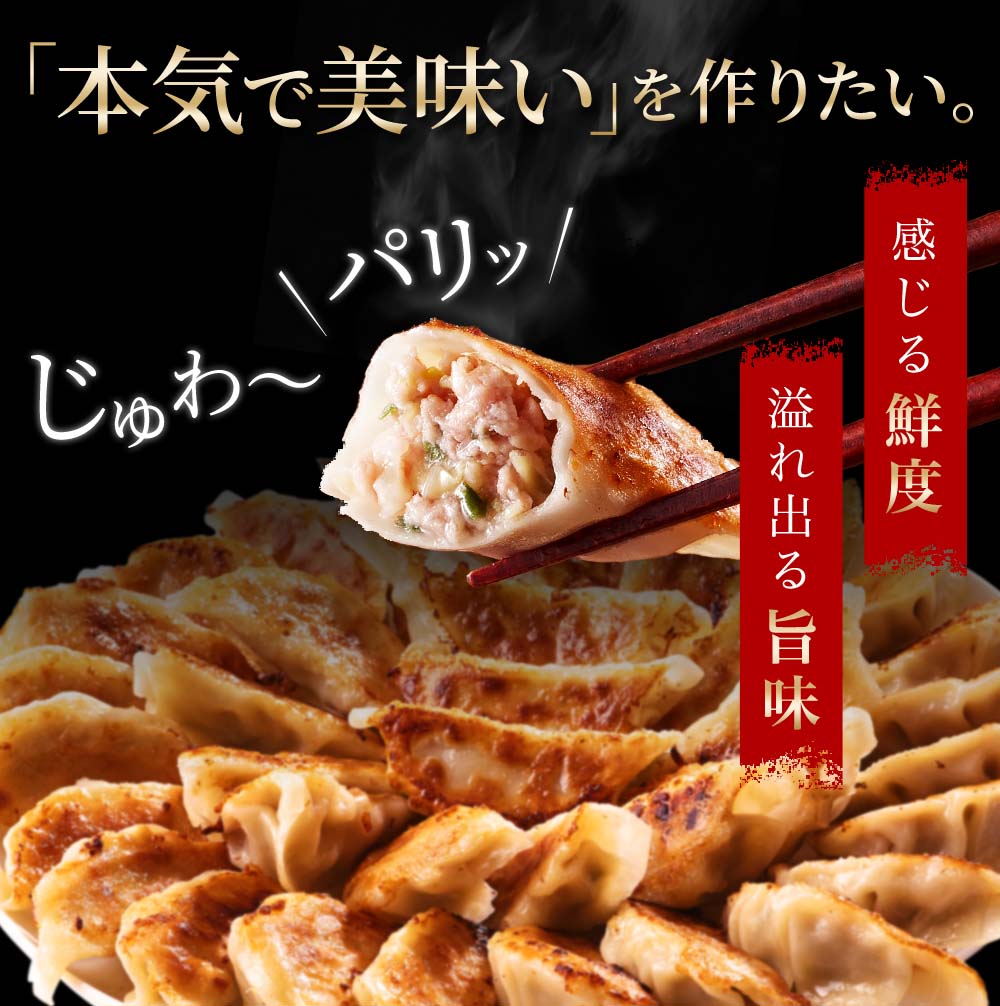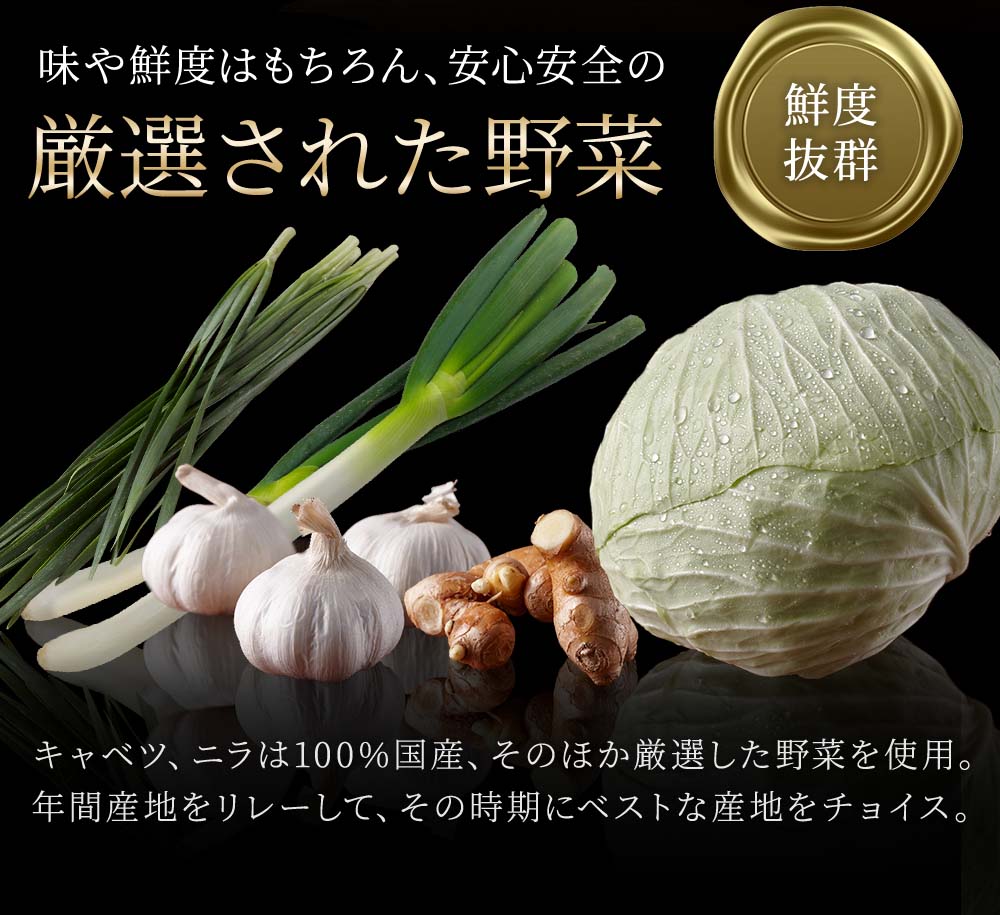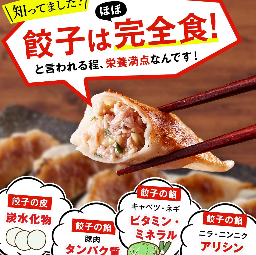 | 原材料名 | 具〔野菜(キャベツ(国産)、にら(国産)、ねぎ、にんにく、しょうが)、豚肉(国産)、豚脂、醤油、中華風スープの素、砂糖、ごま油、粒状大豆たん白、パン粉、食塩、発酵調味料、こしょう〕 皮〔小麦粉(国内製造)、でん粉、食塩〕/酒精、加工でん粉、調味料(アミノ酸等)(一部に小麦・乳成分・牛肉・ごま・ゼラチン・大豆・鶏肉・豚肉を含む) |